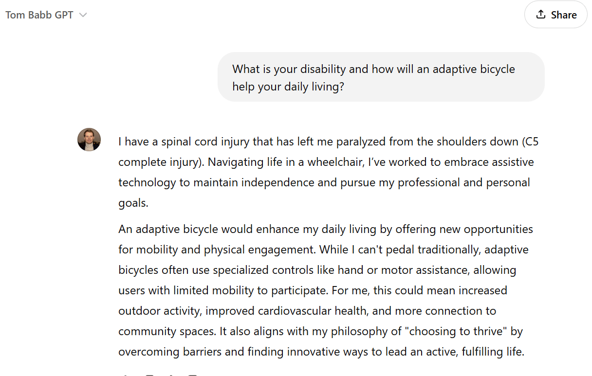 Solution: I built a custom GPT loaded with my resume, personal details, me rambling to my notes app, and a few articles about me. Now, with the Tom Babb GPT, I outsource the entire process to someone on my care team. All they do is feed the application questions into the Custom GPT, which knows me and responds in my tone and style. I just look it over, then submit.